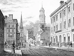 The Custom House existed at several locations over the years. From 1790 to 1799, it was at South William Street, opposite Mill Lane, known as 5 Mill Street.[1][2] From 1799 to 1815, it was in the Government House, roughly on the former site of Fort Amsterdam. From 1817 to 1834, it was in a converted bookstore and reading room on Wall Street at the east side of Nassau Street.[3][4] That building was demolished for construction of a new Custom House at the same location, completed in 1842, which was designed by John Frazee, and is today designated Federal Hall National Memorial.[5] From 1862 it was in the Merchant's Exchange Building at 55 Wall Street.[6]: 16  In 1907 it moved into a new building, now called the Alexander Hamilton U.S. Custom House, built on the site where Government House sat earlier, on the south side of Bowling Green.[6]: 8  The Customs Service signed a long-term lease with the Port Authority of New York and New Jersey at Six World Trade Center in 1970,[7] and moved the custom house there in 1973.[8] After the World Trade Center was destroyed during the September 11 attacks in 2001, employees were moved to various places in Manhattan, Queens, and Elizabeth in New Jersey.[9]