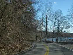 Through Yorktown, NY 129 is a two-lane residential street alongside the reservoir, soon making a gradual bend to the southeast into an intersection with Underhill Avenue, a former alignment of NY 131. At the junction with Underhill Avenue, NY 129 turns southward, soon winding its way southeast under the lanes of the Taconic State Parkway, and back alongside the New Croton Reservoir. After crossing under the Taconic,[3] the route then drops back down to the reservoir and passing a house reported to have been moved from Huntersville before it was flooded.[4] Making several winds to the southeast, NY 129 connects to the Gate House Bridge, soon running eastward through Yorktown. NY 129 intersects with NY 118 (Saw Mill River Road). This intersection serves as the eastern terminus of NY 129, as NY 118 continues east along the reservoir.[3]