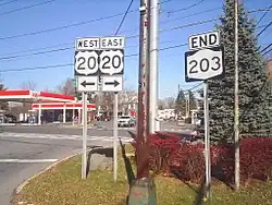 New York State Route 203 (NY 203) is a state highway in the Capital District of New York in the United States. It begins at an intersection with NY 22 in the Columbia County hamlet of Austerlitz and ends at a junction with U.S. Route 20 (US 20) in the Rensselaer County village of Nassau. NY 203 was assigned as part of the 1930 renumbering of state highways in New York. Prior to that time, the section of NY 203 east of Valatie was part of NY 22. The road runs northwest-southeast, and is signed east-west east of Valatie and north-south north of Valatie.