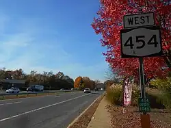 NY 454 begins at a fork along NY 25 (Jericho Turnpike) in Commack. The route heads southeastward as the four-lane Veterans Memorial Highway, passing through a large commercial district built up around NY 454's interchange with the Sunken Meadow State Parkway (exit SM2). From there, NY 454 continues eastward through a residential district for several miles and passes to the south of Whitman Hollow Park. The arterial road continues southeastward through local residential areas with four lanes before meeting NY 347 and the Northern State Parkway at an interchange in Hauppauge. The junction serves as the western terminus of NY 347 and the eastern terminus of the Northern Parkway. NY 347 and NY 454 become concurrent, crossing through Hauppauge and residential properties for the next two miles (3.2 km), intersecting with local roads. After bending around Forestwood Park, Routes 454 and 347 follow the town line and pass the Stoubrough Golf Course, where NY 347 forks to the northeast.[3]
