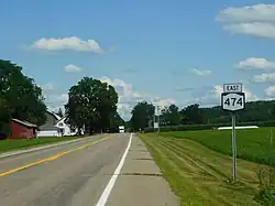 New York State Route 474 (NY 474) is a state highway located entirely within Chautauqua County in the westernmost corner of New York in the United States. It begins at the section of the Pennsylvania state line that runs north–south and runs eastward, initially paralleling the state line before taking a more northeasterly alignment toward Chautauqua Lake. The route ends adjacent to the lake at a junction with NY 394 in the town of Busti. NY 474 was originally designated as New York State Route 74 in 1930 before being renumbered to NY 474 on July 1, 1972. The route continues westward into Pennsylvania as Pennsylvania Route 474 (PA 474), which was assigned in the 1980s.