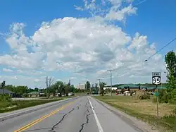 The origins of NY 95 date back to the early 1910s when the highway was improved to state highway standards by the state of New York as part of two separate projects. North of Bombay, the road was rebuilt as part of a contract let on February 18, 1910, that also covered part of what is now NY 37. It was added to the state highway system on November 28, 1910, as State Highway 820 (SH 820). The section between Moira and Bombay was reconstructed under a contract awarded on March 22, 1911, and accepted as a state highway on September 16, 1913, as SH 885. Both numbers are unsigned.[4] In the 1930 renumbering of state highways in New York, NY 95 was assigned to an alignment extending from Saint Regis Falls in the south to the vicinity of Hogansburg in the north. North of Moira, the route was overlaid on SH 885 and SH 820.[2][5] NY 95 was truncated to US 11 in Moira c. 1937,[6][7] and its former alignment south to Saint Regis Falls is now maintained by Franklin County as CR 5.[8][9]