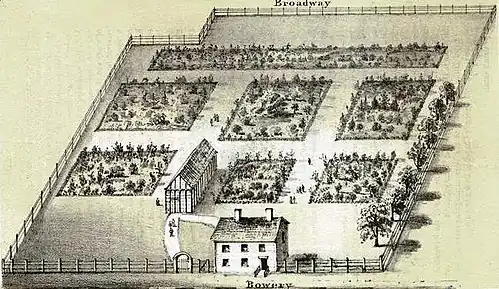 The Vauxhall Gardens was a pleasure garden and theater in New York City. It was named for the Vauxhall Gardens of London.[1]: 132  Though the venue passed through a long list of owners, and suffered buyouts, closings, relocations, and re-openings, it lasted until the mid-19th century.[2]: 45