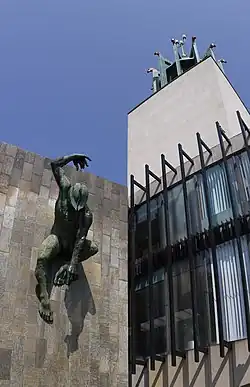 The Civic Centre is also notable for its modern sculptures, in particular the River God Tyne and Swans in Flight, both by David Wynne and the seahorses on the top of the tower by John Robert Murray McCheyne.[14] The cashiers reception of the former rates hall, now the Customer Service Centre, has two abstract murals by Victor Pasmore.[15]