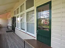 Windows openings are regularly spaced and contain sets of timber, three-light casement windows with rectangular, three-light fanlights above. Ground floor windows on the southern elevation are sheltered by timber-framed hoods with hipped, corrugated metal-clad roofs and supported by solid timber brackets. Hoods are also located over one window and the original doorway on the north elevation. Original timber entrance doors are generally high-waisted with timber ornamentation and panes of obscure glass in the upper section, with the exception of the main entrance double door, which has a larger area of glazing.[1]