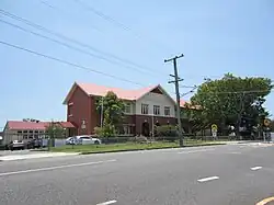 Newmarket State School's new brick school building (now called Block A) was opened on 30 June 1934 by the Minister for Public Instruction (Frank Cooper).[50] It was a two-storey masonry building, constructed from red brick with a darker brick base and pale stucco treatment to the upper floor. It had a hipped roof with gables over the entrances and a prominent ventilation fleche. The main entrance was through a portico with three round arches. Gables featured a half-timbered ornamental effect, utilising timber, fibre-cement panels and terracotta tiles. The building contained 13 classrooms, a head teacher's office, and retiring rooms on both floors. Circulation was provided by an internal staircase at the eastern end and an external timber staircase attached to the western wall. Windows on the southern elevation were protected by terra-cotta tile-clad window hoods. Landscaping in front of the new building including a row of fig trees along the Banks Street fence line (two of which survive), and the laying out of pathways.[51][49][1]