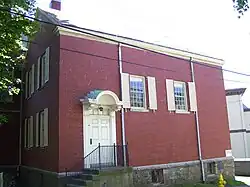 Ground was broken in 1902 for a brick library building at 82 Touro Street, which would be attached to the Sabbatarian Meeting House (previously acquired from Seventh Day Baptists by the society). The new building provided office space for the society, a fireproof vault for historic documents, and a library. In 1915, the meeting house was detached from the library and moved to the rear of the lot. A three-story brick building was constructed between the library and the meeting house. Brick veneer, a slate roof, and steel shutters were added to the exterior of the meeting house to make its exterior covering consistent with the adjoining structures, and to provide added protection from the weather and the threat of fire.[1]