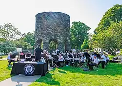 The tower is located at the upper end of the plot behind the now-demolished mansion built by Benedict Arnold, the first colonial governor of Rhode Island, who moved from Pawtuxet to Newport in 1651.[7][8] In 1677, Arnold mentions "my stone built Wind Mill" in his will; the site for his burying ground is between this mill and his mansion and still exists today.[9] The phrase has therefore generally been accepted as referring to the Newport Tower, and is evidence that the tower was once used as a windmill. Still, others have contested that locals remembered the tower was previously a functioning corn mill, and that since it had a ground-level fireplace, it couldn't have been built as a windmill.[10]