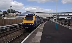 The Great Western Main Line from London to Cardiff was electrified as part of the Great Western Main Line electrification scheme.[27] As part of this the former footbridge was removed in 2017.[28] Following the introduction of Hitachi Rail British Rail Class 800/802 trains and the new timetable introduced on 15 December 2019, journey times between Newport and London Paddington were reduced to around 1 hour 30 minutes[29] The power from Bristol Parkway through Newport was switched on on 14 September 2019, with electric running extended to Newport from 15 December, and as far as Cardiff over the Christmas period.[29]