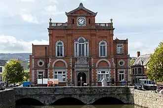 The design required a new three-arched bridge to be constructed to take the weight of the new building.[1] The design of the building involved a symmetrical main frontage with five bays facing onto Bank Parade; the central section of three bays, which slightly projected forward, featured an arched doorway flanked by Doric order columns supporting an entablature inscribed with the words "Town Hall", above which there was an open pediment containing a large cartouche with the town's coat of arms.[1] On the first floor, there was a Venetian window flanked by pilasters and, at roof level, there was a central gable containing a clock topped with a pediment which contained a terracotta panel inscribed with the year "1893" in the tympanum.[1] The outer bays of the central section featured round headed windows flanked by pilasters on the first floor and there was a balustrade with corner urns at roof level.[1] Internally, the principal room was the council chamber.[3]