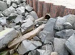 The mill lade ran fully exposed along the side of the Newton-on-Ayr Main Street and would have been a serious nuisance to pedestrians as well as horses, cattle, carts and other road traffic.[10] In 1641 the Newton Burgh Court ruled that "..na personne or personnis sall wash at ye leid betwixt ye dam and ye mylne any foul claithis, puddings, lynnt, hydis or any other fulzie or pollutit thyngis qrby ye watter may be pollutit or fyillit be night or be day."[11]