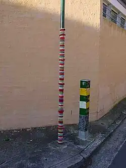 Since the 1980s, the area surrounding the Sydney inner west suburb of Newtown, Australia, including the suburbs of Newtown, Enmore, Erskineville, Camperdown, and St Peters, has been known for its wide range of prominent graffiti and street art on walls.[1] The public visual art in the Newtown area consists of a variety of styles and methods of execution, including large-scale painted murals, hand-painted (or sprayed) political slogans, hand-painted figurative designs, spray painted semi-abstract designs (including large-scale and elaborate semi-pictorial) "tags"), and other stylistic developments such as stencil art and street poster art (also known as "wheatpasting"), "Yarn bombing", and sculptural items cast from plaster and other materials.[2]