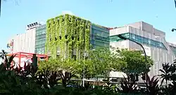 Showing the car park building at the left. Cinemas are right above the carpark. The raised portion on the right houses the Serangoon Public Library.