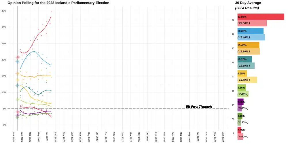 | Maskína | 4–23 Jul 2025 | 1,855 | – | 31.2 | 18.0 | 16.2 | 6.6 | 9.9 | 6.8 | 2.9 | 5.0 | 3.4 | – | 13.2 |