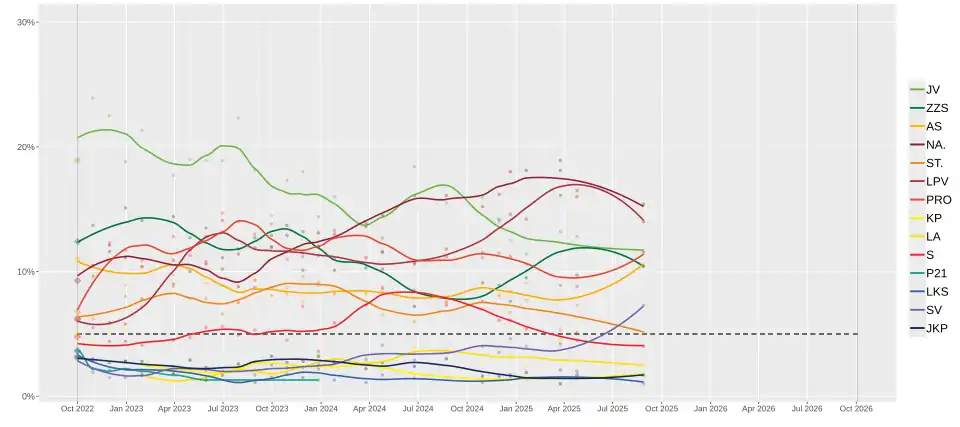 | SKDS/LTV[14] | Oct 2023 | 1,793 | 17.3 | 13.7 | 8.2 | 12.9 | 8.7 | 11.6 | 11.0 | 2.3 | – | 4.5 | 0.7 | 1.8 | 2.3 | 2.7 | 0.4 | 3.6 |