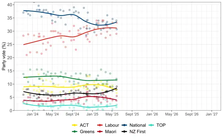 - ^ Day, Tom (3 June 2025). "Poll: NZ First keep rising as National and Labour fall". 1 News.