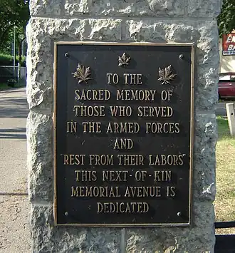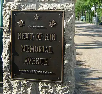 Next of Kin Memorial Avenue is a roadway and National Historic Site of Canada which is part of Woodlawn Cemetery in Saskatoon, Saskatchewan, Canada.[1] Trees along the roadway are dedicated to Saskatoon's war dead. On official city maps, however, the street's name is abbreviated to Memorial Avenue. Many other trees along other roadways within the cemetery are also similarly dedicated.