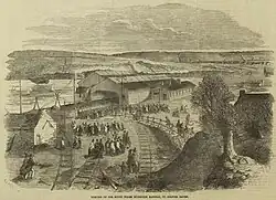The western terminus of the SWR, a station originally named Milford Haven, was opened with the line on 15 April 1856.[4] Very soon there was a twice-weekly steamboat service to Waterford.[5] The station was renamed Neyland in February 1859,[4][6] but was renamed again in November that year, becoming New Milford;[6][7] it was shown as New Milford (Milford Haven) in some timetables.[7]