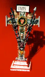His religious pieces inserts emblematic items from Peruvian culture, for example, the Crucifix (cf. below section) with the coca leaves, and the shaman piece (cf. § Curandero (shaman)) with the guinea pig (cuy)[4]