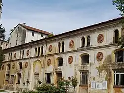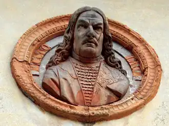 Medallion of Nicolò Tron, a detail of the façade of the Jacquard theatre in Schio