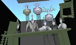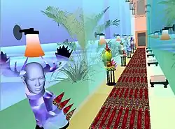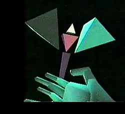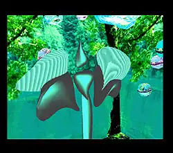Between 1989 and 1992, she created Angels, the first immersive movie.[1] The project foundation was laid out at the Visual Arts Program at MIT, employing Wavefront's Advanced Visualizer on a Silicon Graphics personal IRIS. The VR work was done at the Hitlab (University of Washington) using VPL's Virtualization interface and its Body Electric software running on the IRIS. Angels is a real-time interactive immersive movie, a kind of travel in a virtual paradise. The participant uses a VPL Dataglove and high-resolution HRX goggles developed by Jaron Lanier. Following Tom Furness' theory, the artwork was developed for the three senses: vision, audio and touch, though the technological restraints at the time could only implement vision, audio, and a non tactile data glove. Each user starts his/her experience in front of an odd carousel that is a passage to more VR worlds. Touching one of the three angels’ hearts in the carousel, defines the range in which the following three segments will appear. The duration of the sections varies from just about 30" to 2'30".[2] The brilliantly colourful environments are a gateway to more scenes. The angels' voices ask the users to interact with them, causing a story to open. The music was composed by Diane Thome. While at MIT, Stenger also contributed to the seminal Cyberspace First Steps edited by Michael L. Benedikt with the now famous essay "Mind is a Leaking Rainbow".[3]
