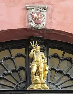 The Keystone above the gate to No. 32 features the names Christopher Klog and Anna Jensdatter. Below the stone is a gilded Neptune figure.[6] Klog (1696–1750), a merchant and brewer, was also director of Kjøbenhavns Brandforsikring.