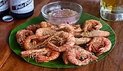 Nilasing na hipon (lit. "drunken shrimp") is a Filipino dish consisting of whole unshelled shrimp marinated in alcohol and various spices, usually coated in batter, and then deep-fried. It is usually dipped in a vinegar-based sauce. The alcohol used is traditionally rice wine like basi or arrack like lambanog; but modern versions can use other types of alcohol, most commonly gin, beer, or white wine.[1][2]