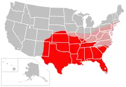 The nine-banded armadillo has been rapidly expanding its range both north and east within the United States, where it is the only regularly occurring species of armadillo. The armadillo crossed the Rio Grande from Mexico in the late 19th century, and was introduced in Florida at about the same time by humans. By 1995, the species had become well established in Texas, Oklahoma, Louisiana, Arkansas, Mississippi, Alabama, Georgia and Florida, and had been sighted as far afield as Kansas, Missouri, Tennessee, Kentucky, and Carolinas. A decade later, the armadillo had become established in all of those areas and continued its migration, being sighted as far north as southern Nebraska, southern Illinois, and southern Indiana.[12] The primary cause of this rapid expansion is explained simply by the species having few natural predators within the United States, little desire on the part of Americans to hunt or eat the armadillo, and the animals' high reproductive rate. The northern expansion of the armadillo is expected to continue until the species reaches as far north as Ohio, Pennsylvania, New Jersey and Connecticut, and all points southward on the East Coast of the United States. Further northward and westward expansion will probably be limited by the armadillo's poor tolerance of harsh winters, due to its lack of insulating fat and its inability to hibernate.[12] As of 2009, newspaper reports indicated the nine-banded armadillo seems to have expanded its range northward as far as Omaha, Nebraska, in the west, and Kentucky Dam and Evansville, Indiana, in the east.[13][14][15] In 1995, armadillos were only seen in the southern tip of South Carolina, and within two to three years, they had swept across most of the state.[10] In late 2009, North Carolina began considering the establishment of a hunting season for armadillo, following reports that the species has been moving into the southern reaches of the state (roughly between the areas of Charlotte and Wilmington).[16][17] Outside the United States, the nine-banded armadillo ranges southward through Central and South America into northern Argentina and Uruguay, where it is still expanding its range.[10]