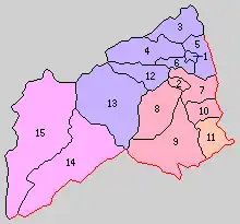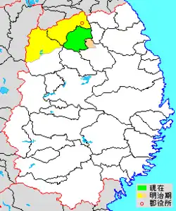 colored area=original extent in Meiji period; green=present area; beige=area transferred to Iwate District