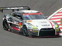 The GT-R Nismo GT3 made its Super GT debut in 2012 at the Okayama International Circuit, with drivers Katsumasa Chiyo and Yuhi Sekiguchi. The car won its first race in the fourth round of the season at Sportsland Sugo, and also scored a podium finish in the following round at Suzuka. It was 4th in the final standings.[26] A couple of difficult seasons followed, in 2013 the car failed to score a single podium finish, in 2014 it only managed to win a race.[27][28] But in the 2013 JAF Grand Prix, team NDDP Racing, with driver Daiki Sasaki won the first race, starting from pole position. In the second race, the car only managed to finish 7th, and ended up being the runner-up of the 2013 JAF Grand Prix. It set the fastest laps in both races, as Nismo Athlete Global Team and NDDP Racing set the fastest laps of the first and second races respectively.[29] The car bounced back in the 2015 season, team Gainer No.10 car, driven by André Couto won the championship, scoring 2 race wins and 4 podium finishes. Including the results of team NDDP Racing, the car finished the season with a total of 4 race wins and 7 podium finishes.[30]