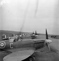In August 1944 the squadron moved to RAF Tangmere and re-equipped with the more powerful Griffon-engined Spitfire XIV.[1] The new Spitfires used the increased performance to operate Diver sorties: the interception of V-1 flying bombs.[1] As the war progressed in mainland Europe the squadron started to operate ground-attack sorties over France and in October moved to Belgium to carry on the same role. It returned to England in May 1945.[1]