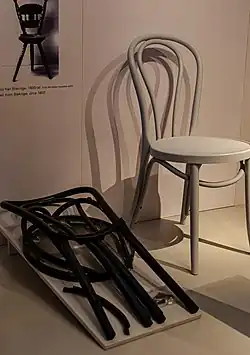 The No. 14 chair is the most famous chair made by the Thonet chair company. Also known as the "bistro chair", it was designed in the Austrian Empire[1] by Michael Thonet and introduced in 1859, becoming the world's first mass-produced item of furniture.[2][3] It is made using bent wood (steam-bending), and the design required years to perfect. With its affordable price and simple design, it became one of the best-selling chairs ever made. Gebrüder Thonet sold 50 million No. 14s between 1859 and 1930,[4] and the company's successor-organisations have sold millions more since then.[5] "It represents the best example of a design which has been refined to the point where there is no way to improve it."[6]