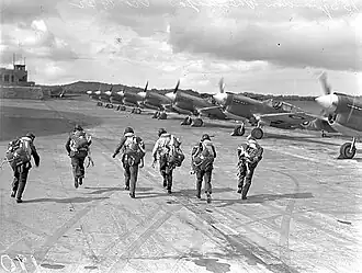 ![]() Pilots of No. 15 Squadron running to their Kittyhawks at Whenuapai, October 1942 | |