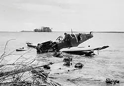 A crashed Kittyhawk of No. 17 Squadron in the shallow waters on the approach to Munda airstrip, New Georgia; September 1943