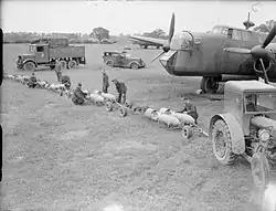 Armourers prepare 500-lb GP bombs for Armstrong Whitworth Whitley of 58 Squadron at RAF Linton-on-Ouse