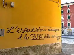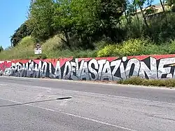 Among the campaign slogans that have arisen from demonstrations, besides No Cav, there is "Basta Cave"[40] (lit. Enough Quarries: Stop the Quarries), "Giù le mani dalla montagna"[41] (Hands off the Mountain), "Fermiamo la devastazione"[42] (Let's stop the Devastation), "Help Apuan Alps",[43] "Le cave uccidono il passato e il futuro"[4] (The quarries are killing the past and the future), "Excavation devastation",[13] and more.