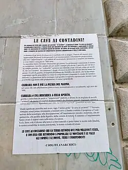 In the same year, following the umpteenth flood that hit the city of Carrara, the "Assemblea Permanente Carrara" (Carrara Permanent Assembly) was born. The activists occupied the town hall for two months.[112] This group fights for the environmental protection of the Carrara territory and sometimes expressed very critical positions towards the quarries.[113]