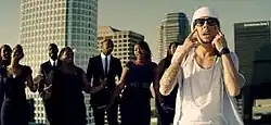 Dappy in the scene alongside gospel choir backing singers on top of an L.A. skyscraper in the music video for "No Regrets".
