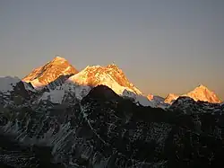 Mount Everest is the peak on the left, viewed from Gokyo Ri.