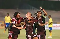 Wilson celebrating a goal with team mates Dipendu Biswas & Du