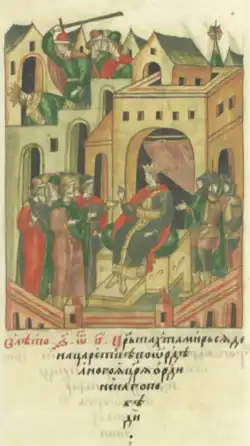 However, Tokhta would prove a more headstrong ruler than either Tuda-Mengur or Talabuga. Nogai and Tokhta soon found themselves embroiled in a deadly rivalry; while they cooperated in raids against rebellious Russian principalities, they remained in competition; the Russian chroniclers gave Nogai the title of tsar as he was perceived to be the one in power.[4] Tokhta's father-in-law and wife often complained that Nogai seemed to consider himself superior to Tokhta, and Nogai repeatedly rejected any demands Tokhta made of him to attend his court. They also disagreed over the policy of trading rights for the Genoese and Venetian cities in Crimea. Two years after Nogai installed Tokhta, their rivalry came to a head and Tokhta set out to gather his supporters for a war against Nogai.[24][25]