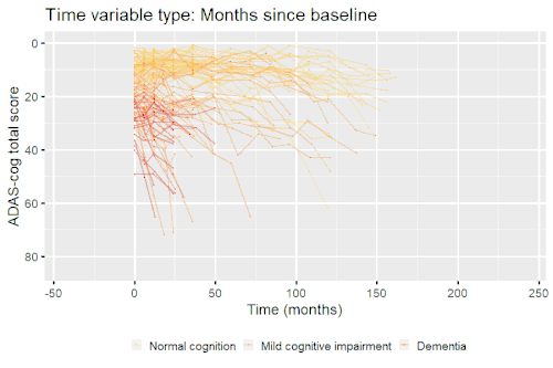 An example of such a model with an exponential mean function fitted to longitudinal measurements of the Alzheimer's Disease Assessment Scale-Cognitive Subscale (ADAS-Cog) is shown in the box. As shown, the inclusion of fixed effects of baseline categorization (MCI or dementia relative to normal cognition) and the random effect of individual continuous disease stage aligns the trajectories of cognitive deterioration to reveal a common pattern of cognitive decline.