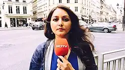 As Europe correspondent and Resident Editor with NDTV, Tiwari reported major events and stories from all over the continent since 2004. She reported extensively on tax evasion and money laundering with exclusive interviews of major whistleblowers in the world of finance.[15][16][17] She also contributed episodes on Sikhs in France, Indian Soldiers in WW1 for NDTV's India Matters.Her breaking news report on the French aircraft carrier Clemenceau (2004) was followed by an extensive coverage of the story in Indian media and the aircraft carrier had to eventually return after India's Supreme court ruling.[18] In her interviews with LTTE cadre (2006), Anton Balasingham expressed regret for Rajiv Gandhi's killing which was the closest the militant outfit came to admitting their responsibility for the murder.[19][20] Tiwari has covered several major elections in Europe and Indo-French bilateral visits.[21][22] Tiwari also reported on the COP21 Paris summit,[23] the Greek referendum,[24] Papal Conclaves,[25] Indo-French civil nuclear deal,[26] Italy-India diplomatic row over marines,[27] India and Pakistan at the International court of justice, the Mittal Arcelor take over.[28] She won the ENBA 2016 award, Best International coverage for the Paris terror attacks.[29][30]