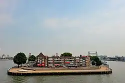 ![]() The Noordereiland in Rotterdam, with De Rotterdam in the background on the left, the Erasmus Bridge on the right, and the Maaskade in the foreground, with the Hulstkamp building on the left | |
