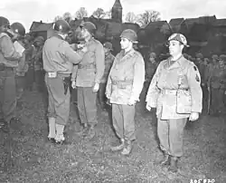 Cota was awarded the Distinguished Service Cross (DSC), Distinguished Service Order (DSO) and Silver Star for his heroism on Omaha Beach.[32] Field Marshal Sir Bernard L. Montgomery pinned the DSO on Cota.[33] He received a Purple Heart and a second Silver Star in the attack at Saint-Lô.[33]