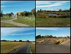 Areas of Norman Kirk Park – Clockwise from upper left: Kaiapoi Dog Park, Beswick Stormwater Area & The Honda Forest, Sports Fields, and Kaiapoi Community BMX Track