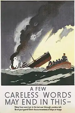 During the Second World War, Norman Wilkinson was again assigned to camouflage, not in dazzle-painting ships (which had fallen out of favour) but with the British Air Ministry, where his primary responsibility was the concealment of airfields.[11] He also travelled extensively to sketch and record the work of the Royal Navy, the Merchant Navy and Coastal Command throughout the war. An exhibition of 52 of the resulting paintings, The War at Sea, was shown at the National Gallery in September 1944. It included nine paintings of the D-Day landings, which Wilkinson had witnessed from HMS Jervis, plus naval actions such as the sinking of the Bismarck. The exhibition toured Australia and New Zealand in 1945 and 1946. The War Artists' Advisory Committee bought one painting from Wilkinson; he donated the other 51 paintings to the committee.[12]