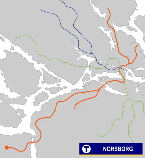 Norsborg metro station is the end station on the red line of the Stockholm metro, located in Norsborg, Botkyrka Municipality. The distance to Slussen is 20.8 km. The station was opened on 12 January 1975 as the southwestern terminus of the extension from Fittja.[2]