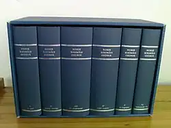 A preliminary wordlist issued by Riksmaalsvernet in March 1921 led to a fierce linguistics debate in newspapers and in the cultural and literary magazine Samtiden.[2][4][5][6] In 1922 Alf Sommerfelt was appointed as editor for the dictionary.[7] Trygve Knudsen joined the work in 1924, and was co-editor for the project from July 1925.[3][8] Harald Noreng joined as secretary in 1938, and as co-editor from 1940.[9][10] The dictionary was issued in parts, starting from 1930, and the work was completed in 1957, and printed in four volumes.[3][8][11] From 1981, the Norwegian Academy for Language and Literature has been responsible for the dictionary.[12] A reprint of the four volumes was issued in 1983, and again in 1991.[10][12]