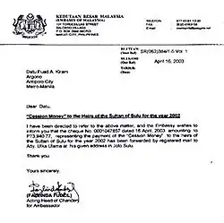 - ^ "'Malaysia has stopped paying cession money to Sulu Sultanate since 2013'". The Borneo Post. 23 July 2020. Archived from the original on 1 March 2021. Retrieved 13 July 2022.